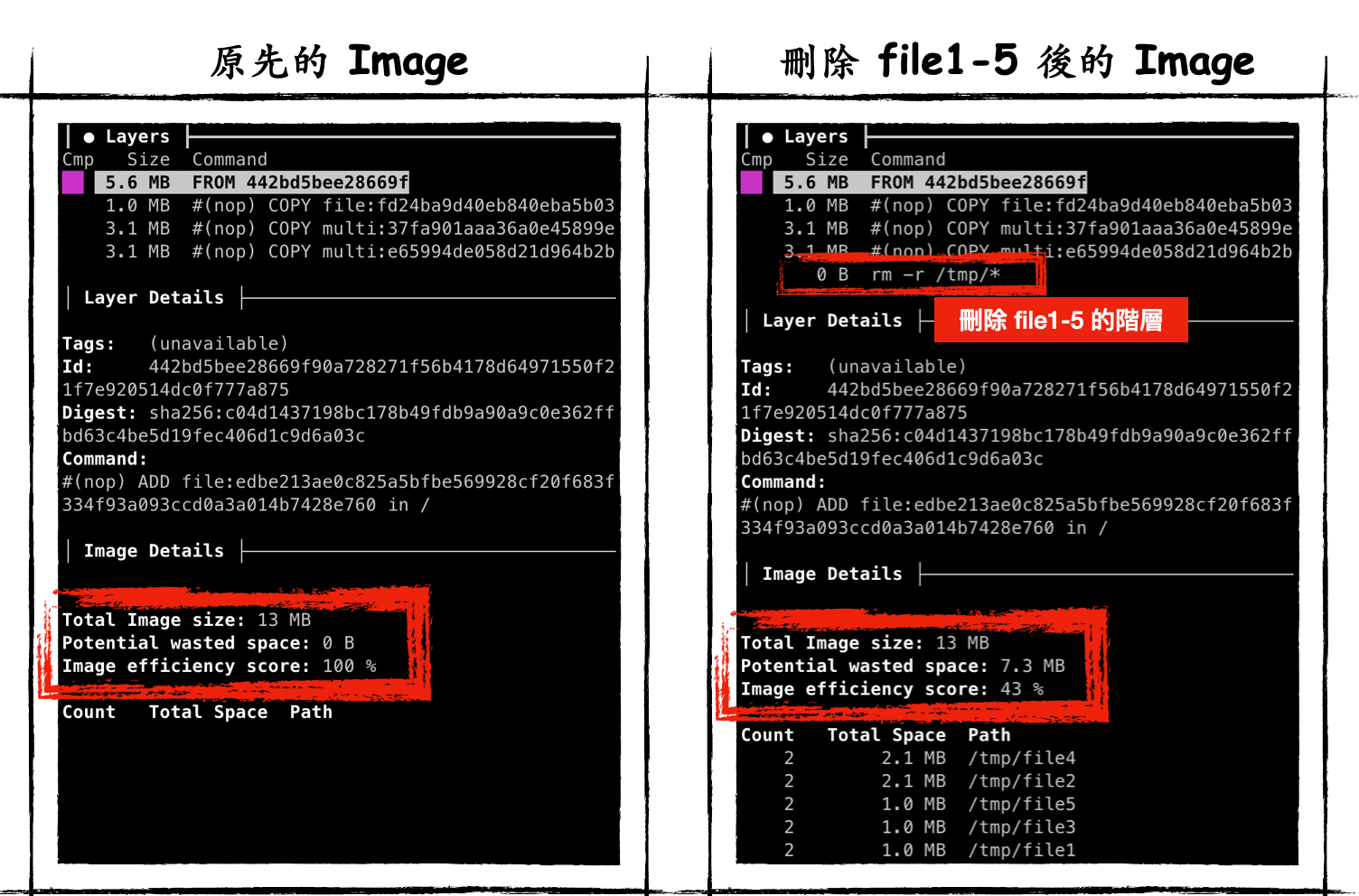 圖中看到刪除後的效率從 100% 變成 43% 而已,並且相較原先 Image 浪費了 7.3 MB 的空間。那有哪些方法能更快速的創建出高效的 Image 呢?