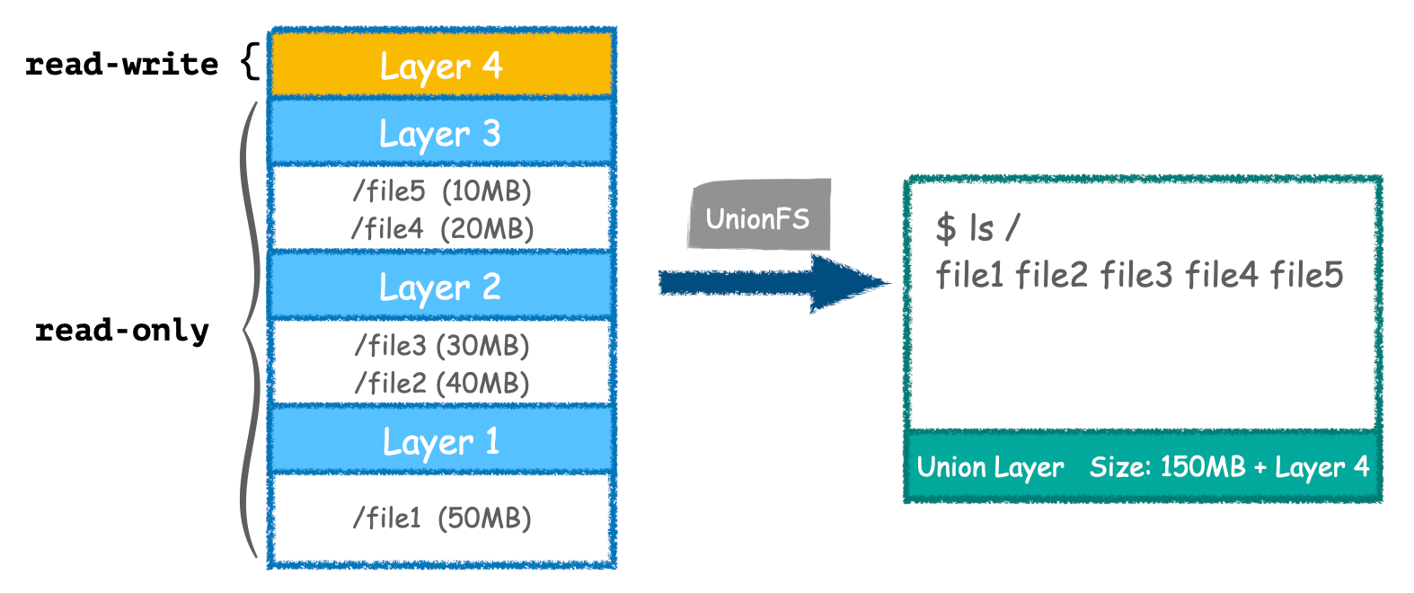 首先必須先了解 Docker 和 UnionFS[1] 的關係。簡而言之每一層 Layer[2] 包含許多檔案,而 Docker Image 就是一層疊一層的集合體。看看以下的示意圖: